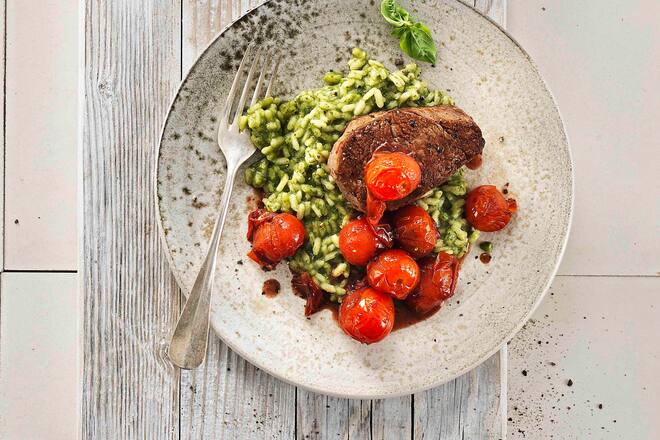 Saftiges Rindsfilet mit Basilikum-Risotto