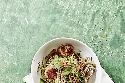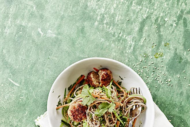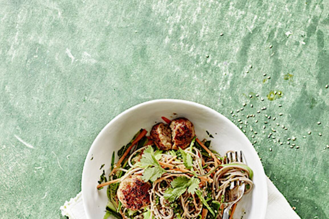 Asiatische Schweinsspiesse auf Reisnudeln