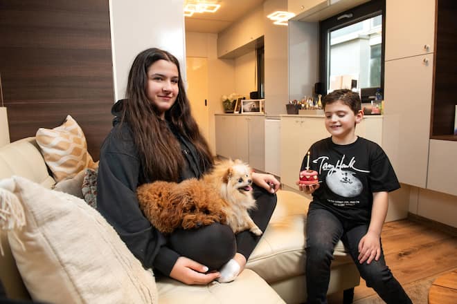 Es gibt einen Wohn- und einen Schlafbereich, viele Wandschränke und ein Bad. Eine Kochecke braucht der Wagen nicht. «Ich esse immer im Wohnwagen meiner Eltern. Gemeinsame Mahlzeiten sind für uns sehr wichtig.» Was es heute gibt, weiss ihr kleiner Bruder Maycol junor (7), der von allen Maycolino gerufen wird. «Pasta! Dein Lieblingsessen!» Er selbst bevorzugt Pizza – die italienischen Wurzeln von Papa Maycol Errani (39) lassen grüssen. Maycolino hat die beiden Familienhunde, Pudel Lilli und Zwergspitz Vanille, mitgebracht und fläzt sich mit ihnen aufs Sofa. «Drück sie nicht zu fest», tadelt Chanel ihren kleinen Bruder liebevoll, als er die flauschige Vanille herzt. «Man muss den Tieren ihren Freiraum lassen.»