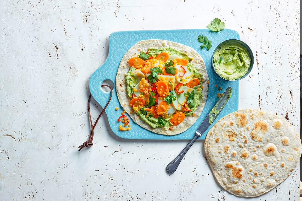 Piadine nacheinander in einer beschichteten Bratpfanne beidseitig ohne Fett braten. Avocadomasse darauf verteilen, Kohlrabisalat darauf anrichten.