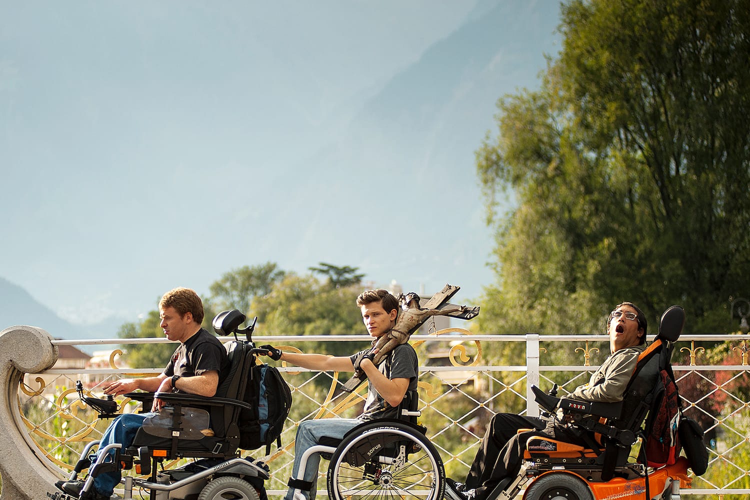 Die Szene: Rüpelhaft rempeln die drei ungewöhnlichen Freunde mit ihren Rollstühlen Passanten in der belebten Fussgängerzone von Meran an. Köstlich die fast entschuldigenden Reaktionen der Betroffenen.