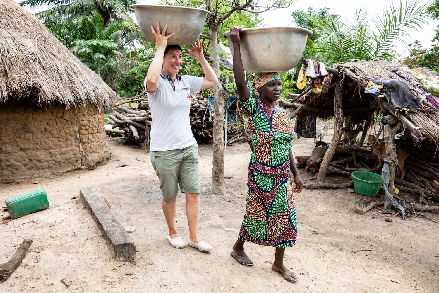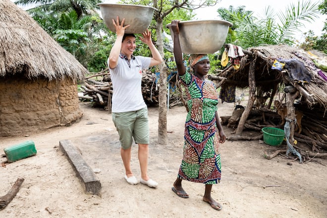 Bernard von DierendonckYawa Mewezino lädt die Besucherin zum nahen Brunnen, setzt sich eine Blechschüssel auf den Kopf, Gisin macht es nach. Vor zehn Jahren haben Einheimische den Ziehbrunnen gebaut, mit Spendengeldern aus der Schweiz. Davor mussten sie das Wasser aus einem Fluss holen, vor allem während der sechsmonatigen Regenzeit war dieses dreckig – viele starben an Durchfall. Yawa füllt ihre Schüssel mit 25 Litern, Dominique sagt nach zehn Litern stopp! Dann balanciert sie die Schüssel auf dem Kopf bis vor Yawas Küche. Kein bisschen Wasser schwappt über, die Einheimischen klatschen. Die Abfahrts-Olympiasiegerin nimmt ihr Handy hervor. Im Nu ist sie von Jugendlichen umringt, die ganz Kleinen jedoch beobachten sie verstohlen, sie haben noch nie eine Weisse gesehen.