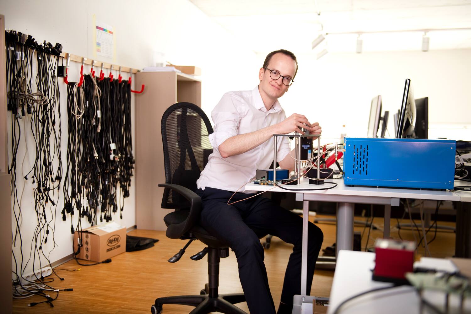 Auf dem Tisch steht Neukoms Stolz: eine von ihm entwickelte blaue Box, mit der er testet, welche Materialien für Solarzellen geeignet sind. «Wir haben 40 Stück davon an Forscher auf der ganzen Welt verkauft.»