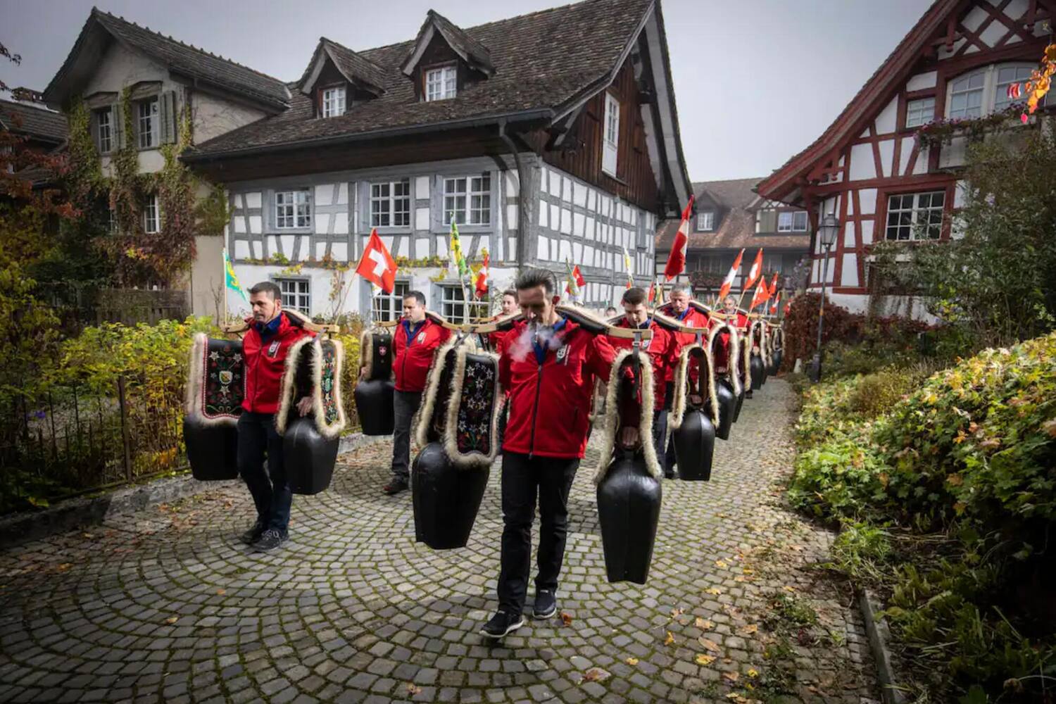 Im Gleichtakt hallt das archaische Geläut der Treicheln durch den Dorfkern des thurgauischen Weinbauorts Ottoberg. Bewohner schauen am Strassenrand zu, eine Frau klatscht und ruft den Vorbeiziehenden zu: «Ein wunderschöner Lärm! Das sind noch wahre Trychler!» 16 Mitglieder der Silvester-Treichler Märstetten sind unterwegs, sie proben für ihren nächsten Auf-tritt: An Silvester werden sie in ihrem Dorf traditionsgemäss das alte Jahr ausläuten. Nun paradieren sie bedächtigen Schritts die Dorfstrasse rauf, man versteht kaum das eigene Wort.