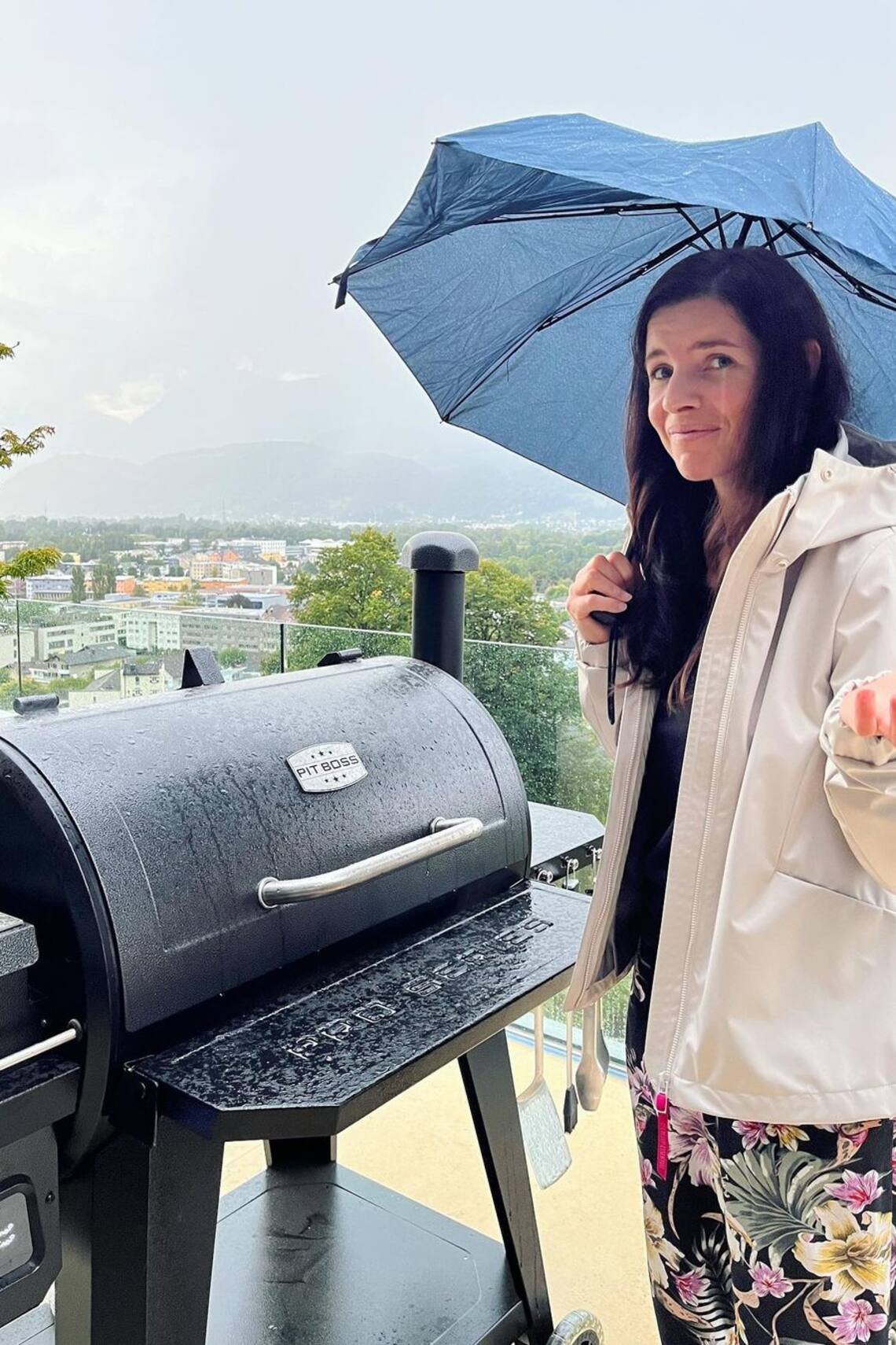 Tina Weirather hingegen hat der Regen einen Strich durch die Rechnung gemacht. Die ehemalige Skirennfahrerin aus Lichtenstein steht mit Regenschirm am Grill auf der Terasse. Ein lauschiger Grillabend sieht anders aus, doch Tina Weirather lässt sich vom Regen nicht die Laune verderben.