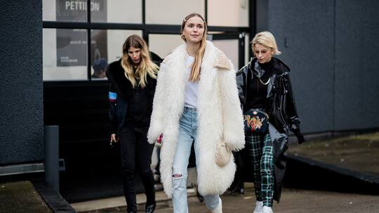 Getty ImagesPernille Teisbaek (mit Veronika Heilbrunner und Caro Daur) im Céline-Mantel an der Kopenhagen Fashion Week.