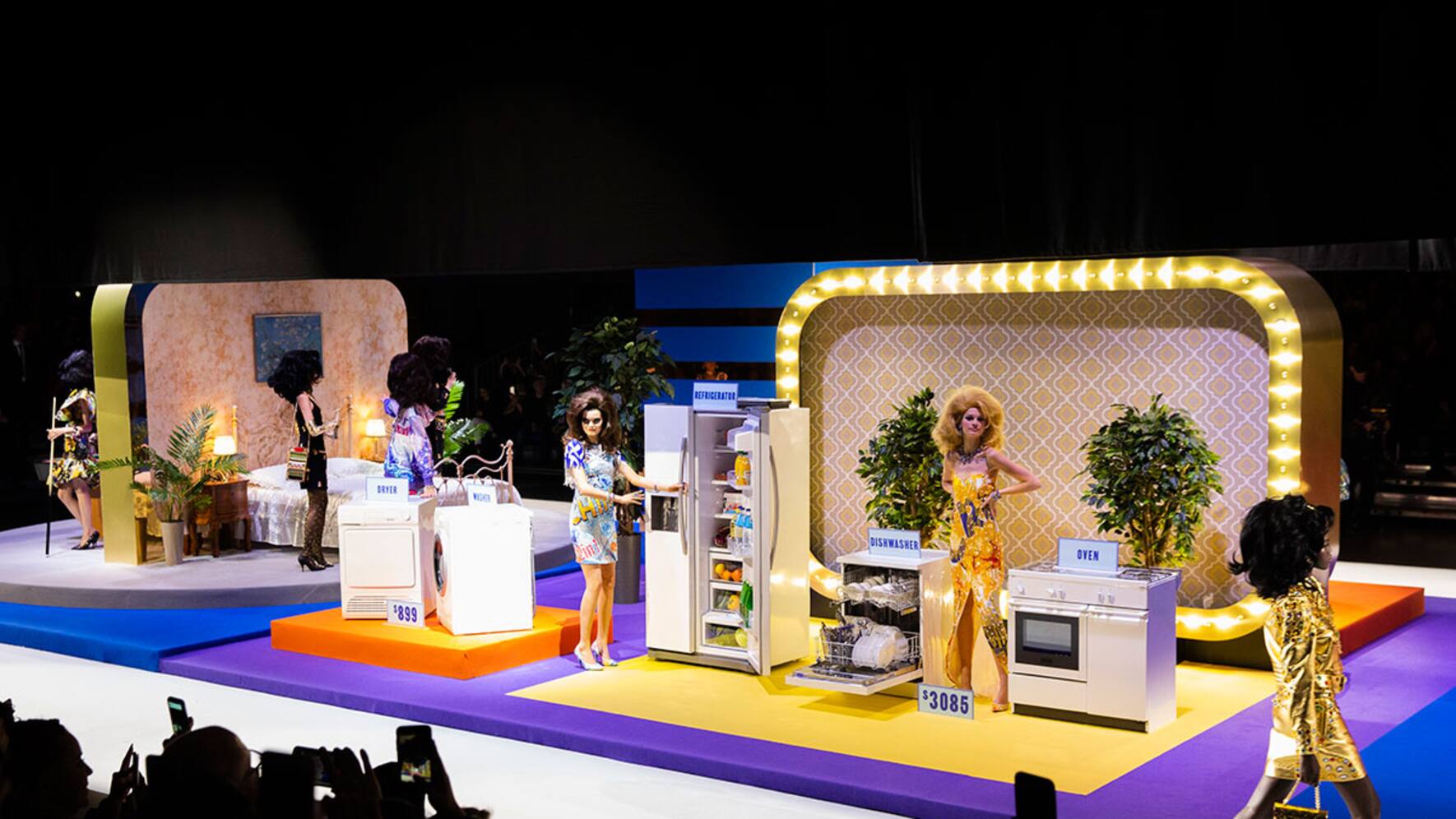 Der Preis war sowas von heiss: Der Runway bei Moschino wurde zu einer TV-Studio-Kreuzung aus Quizshow und Home Shopping Channel.