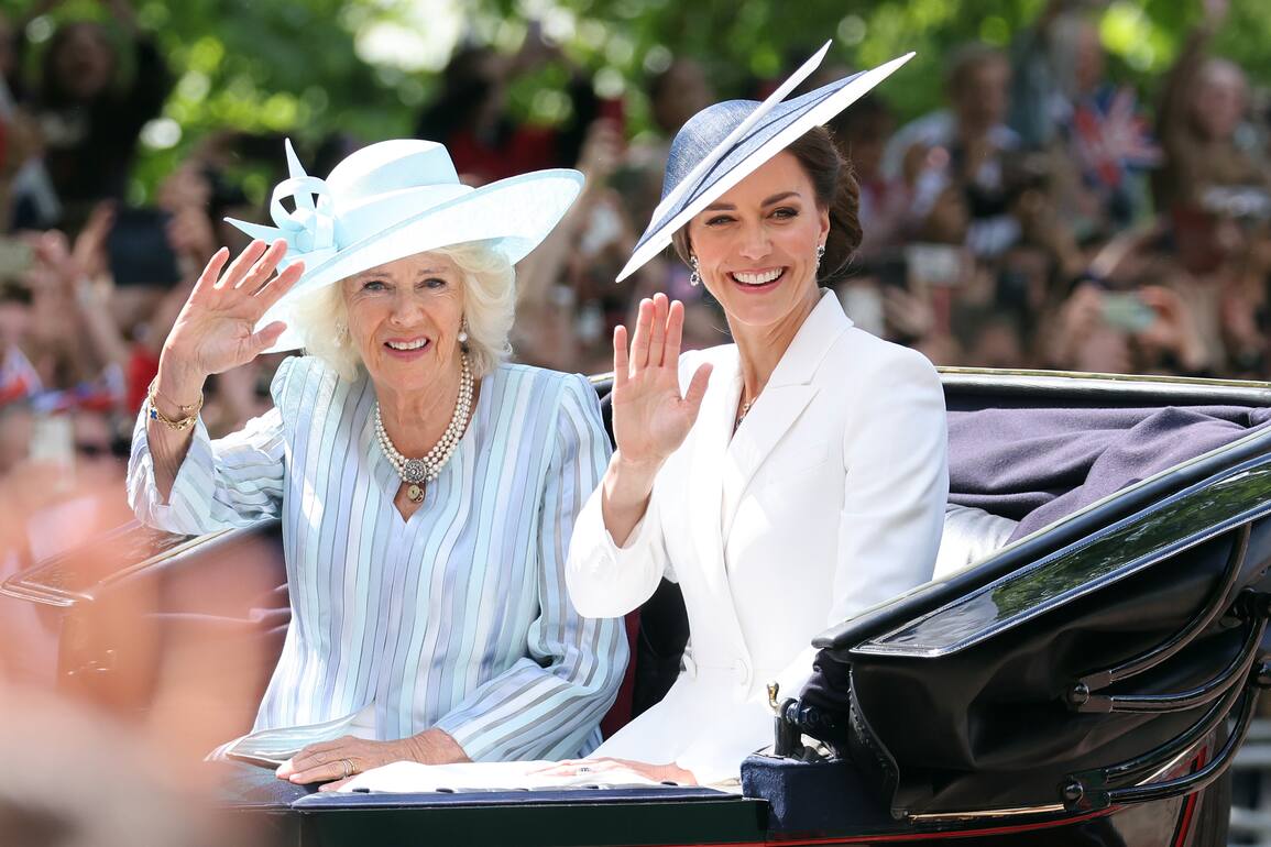 Beim Auftakt zu den Feierlichkeiten zum Platin-Thronjubiläum von Queen Elizabeth II. glänzte Herzogin Kate in Weiss. Die Ehefrau von Prinz William trug bei der Parade «Trooping the Colour» ein recyceltes Blazerkleid von Alexander McQueen im Wert von umgerechnet etwa 3.500 Euro. Kate strahlte in dem Outfit, während sie mit Herzogin Camilla und ihren drei Kindern Prinz George, Prinzessin Charlotte und Prinz Louis aus einer Kutsche die Menschen grüsste.