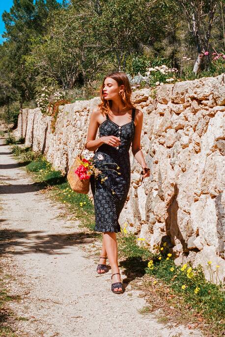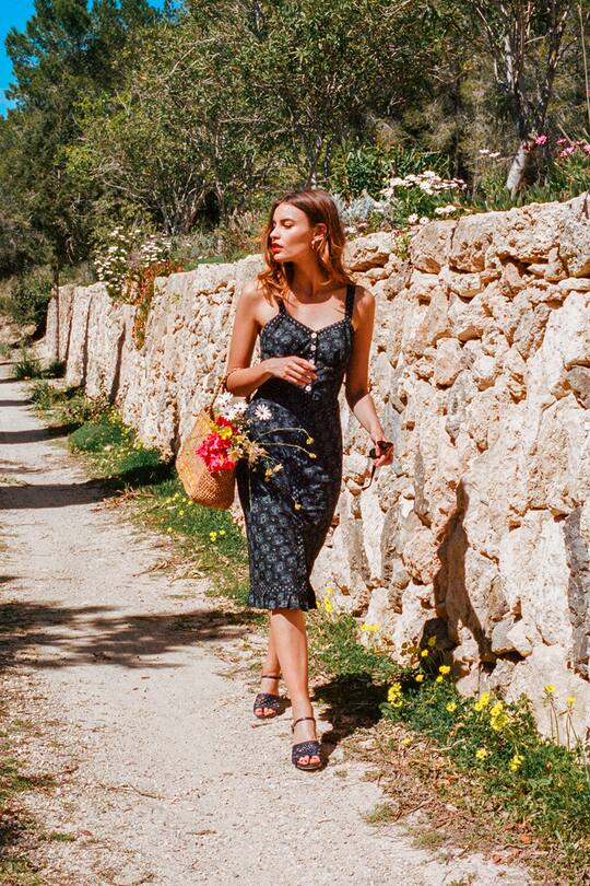 Jeanne Damas ist sowas wie die Vorzeige-Französin. 860.000 Followers liken bei Instagram ihre Bilder mit Blick auf die Pariser Skyline, an Bistro-Tischchen, auf samtenen Sesseln. Sie hat Rehaugen, einen Pony, Schmollmund. Ein bisschen so, wie Jane Birkin damals. Ja, man würde ohne zu zögern mit Jeanne tauschen. Gute Nachrichten: Immerhin den Stil der 26-Jährigen können wir uns nach Hause holen. Jeanne Damas hat nämlich das Label Rouje gegründet und das ist der stoffgewordene Traum eines jeden Blümchenkleid-Fans mit einer Schwäche für die Provence und die 70er Jahre.