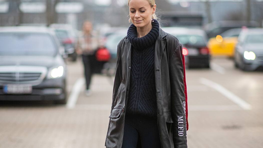 Thora Valdimars knackt so ziemlich jedes Kleidungsstück. Hier die Leggings: Funktioniert wegen toller Pumps, klassischem Turtleneck und Midi-Mantel. Check!
