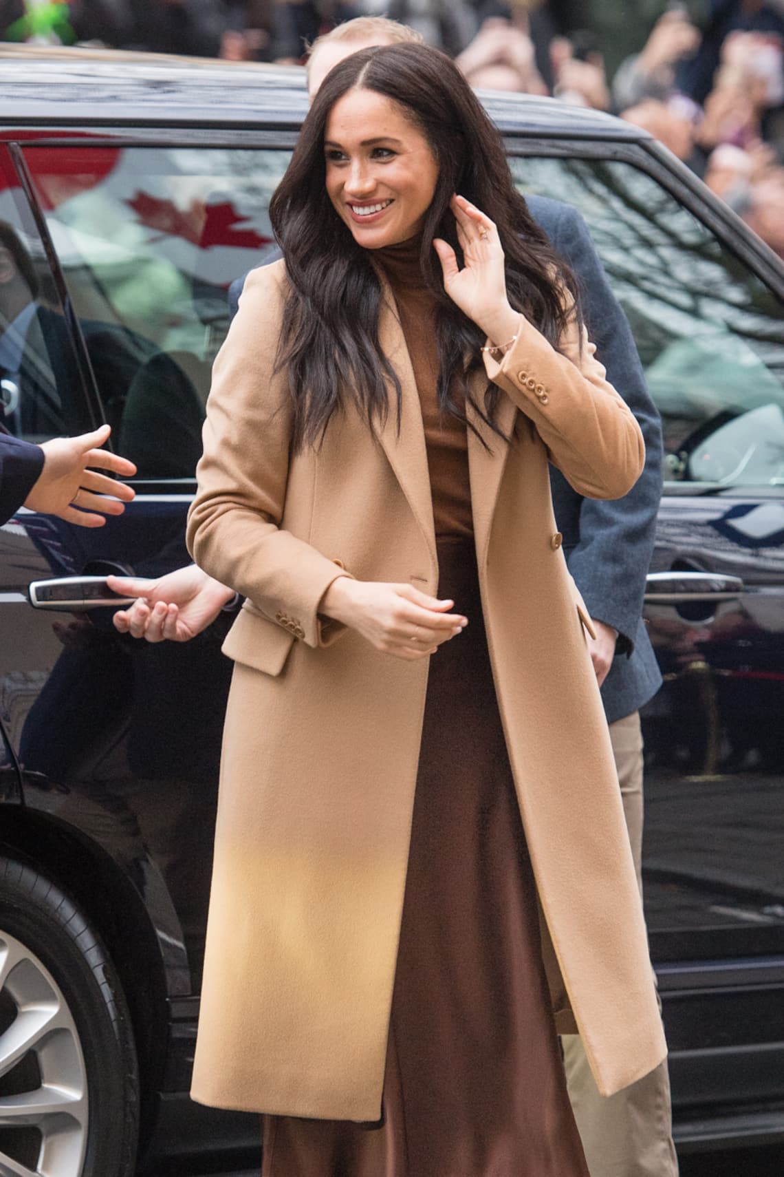 Ihr vollendet abgeschmeckter Look, mit dem sie nach sechs Wochen aus den Weihnachtsferien zurückkehrt, ist wie aus einem Guss – als würde er uns lauwarm die Kehle hinabgleiten. So begleitete sie Prinz Harry beim Besuch bei Kanadas High Commissioner Janice Charette in einem schimmernden mokkabraunen Satinrock, einem zarten Rollkragenpullover in Nougat, einem Camel-Mantel in einem Toffee-Ton und Pumps mit optischem Röst-Aroma. Dazu fiel sinnlich das kaffeebraune Haar über die Schultern.