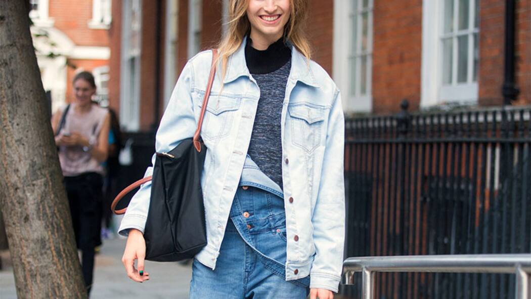 Auch bei wärmeren Temperaturen setzt das Schweizer Topmodel auf Coolness. Den Double-Denim-Look meistert Manuela Frey in London mit einer Kombi aus Latzhose und heller Jeansjacke. Dazu gibts auch hier Sneaker und eine grosse, praktische Tasche statt kleiner Clutch.
