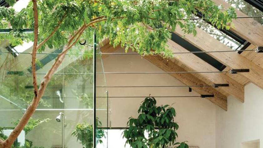 Perfektes Outdoor-Feeling verleihen Bäumchen und Pflanzen in diesem grossflächigen Badezimmer.
