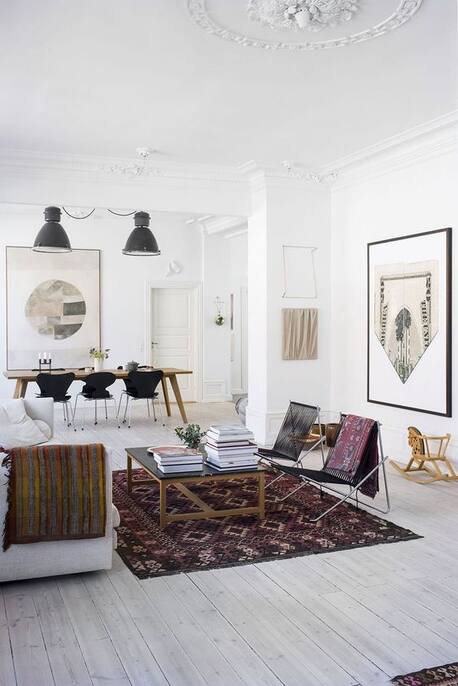 Dos: Ein Teppich kann den Raum optisch zusammenhalten und die Verbindung zwischen Sofa und Beistelltisch oder weiteren Sitzmöbeln darstellen. Wer andererseits zum Beispiel einen offenen Wohn-Essbereich hat, kann mit einem Teppich unter Tisch und Stühlen für eine visuelle Abgrenzung sorgen. Die gemusterten Perser am besten zu unifarbenen Möbeln kombinieren und nur mit Accessoires wie Kissen weitere, farbliche Akzente setzen.