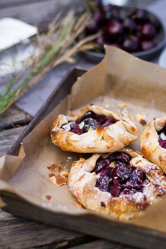 nom-nom | www.nom-nom.chKirschen zu entsteinen ist etwas mühselig, der Aufwand lohnt sich aber. Sogar die rot gefärbten Finger nimmt man für den Genuss dieser köstlichen Galettes gerne in Kauf. Ganz nach Geschmack kann das süsse Gebäck natürlich auch mit anderem Steinobst wie Aprikosen, Nektarinen oder Pflaumen gebacken werden. Grössere Früchte werden in Schnitze geschnitten und kreisförmig auf dem Teig ausgelegt.